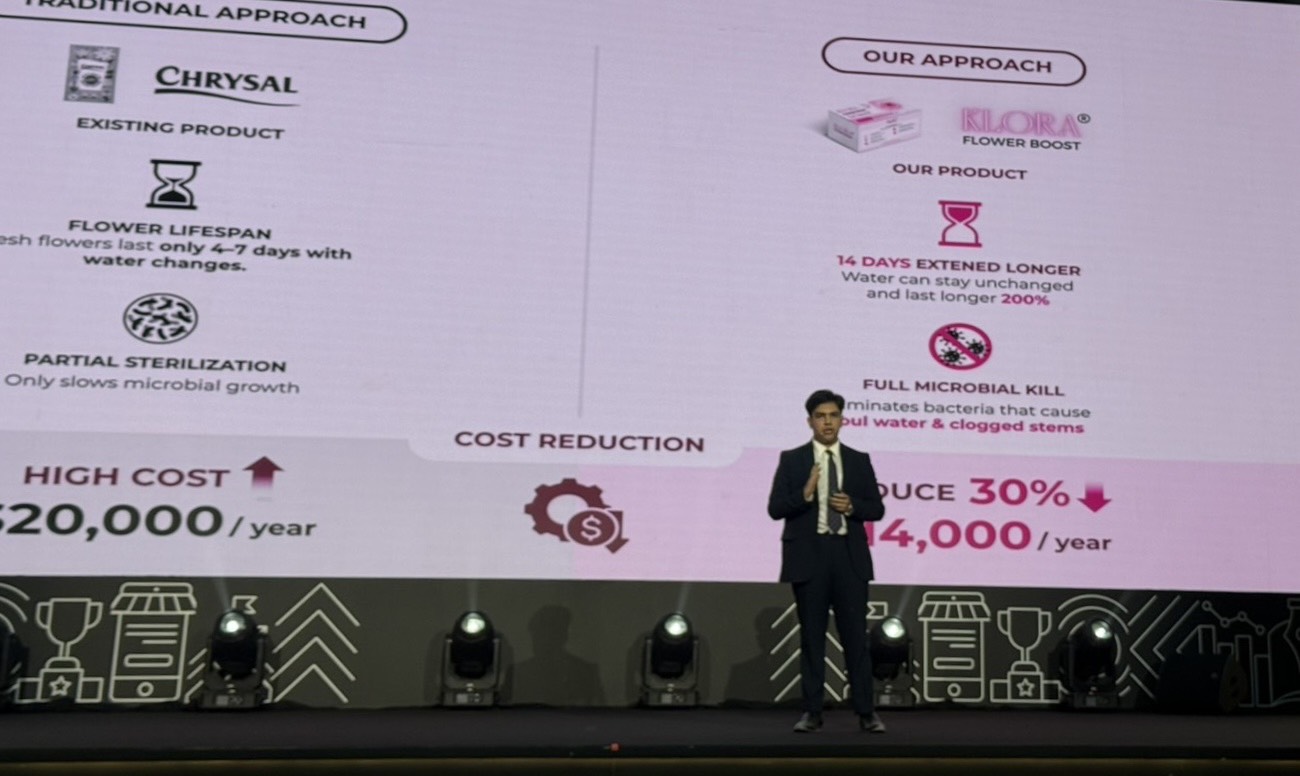 Competing against the top 100 startups from over 47 countries, the KLORA TEAM showcased their groundbreaking idea: KLORA Flower Boost, a flower life-extension effervescent tablet. KLORA Flower Boost is an innovative, safe, and sustainable solution designed to extend the freshness and shelf life of cut flowers. By preventing microbial spoilage grey mold, their technology enhances water and nutrient absorption while preserving natural flower colours. This innovation directly helps producers reduce waste and meet demanding export standards.