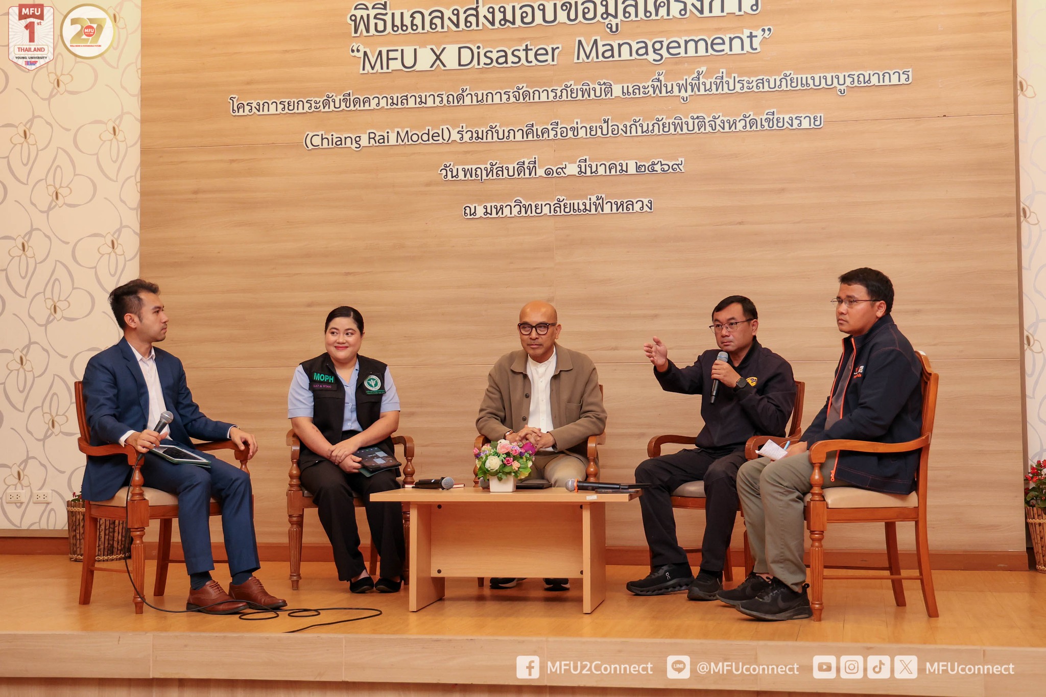 Mae Fah Luang University (MFU) held an event to present and share data from the "MFU X Disaster Management" initiative under the Integrated Capacity Building and Disaster Recovery Project (Chiang Rai Model) on 19 March 2026, at the Kham Mok Luang Room, Mae Fah Luang University.