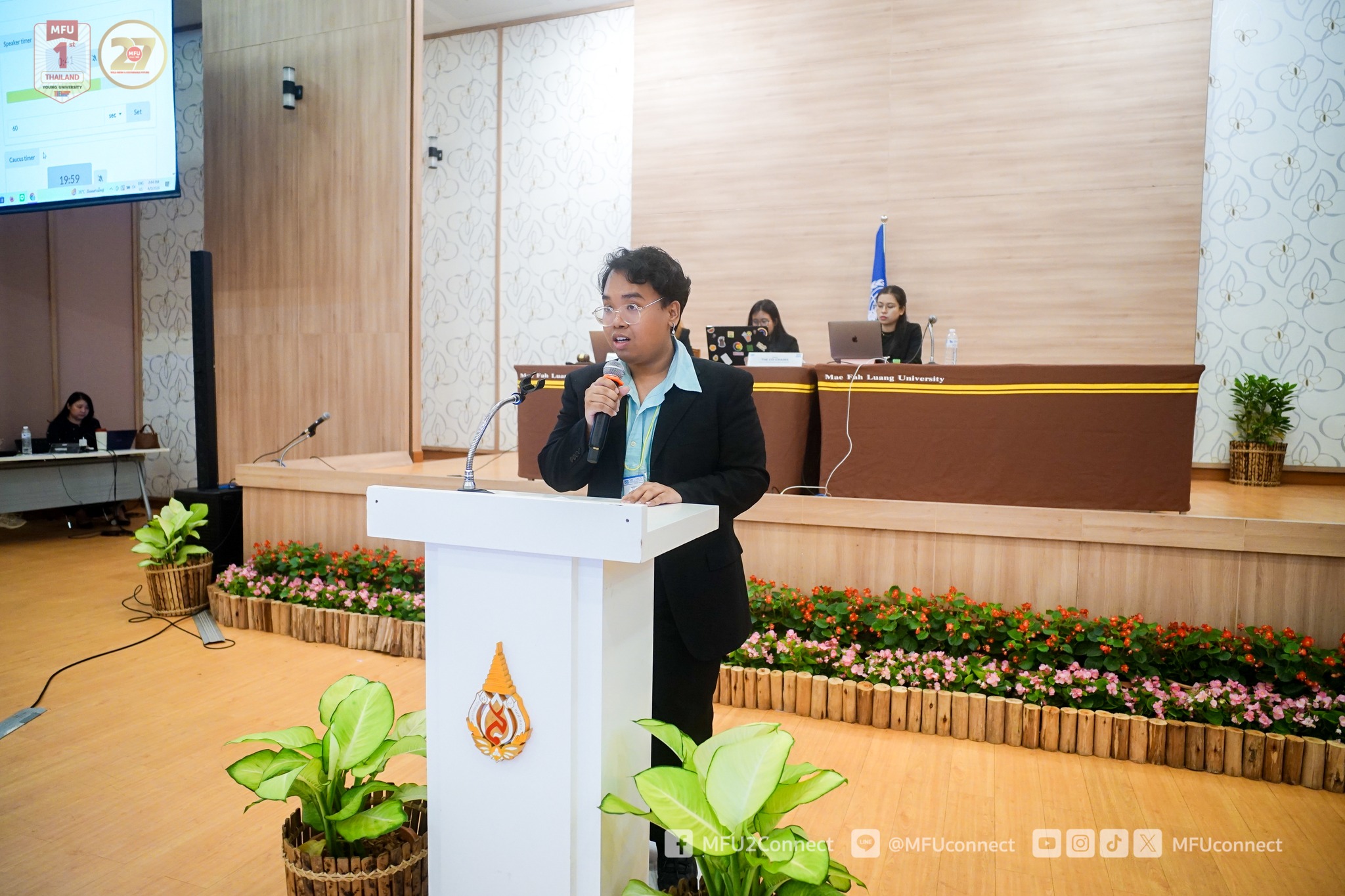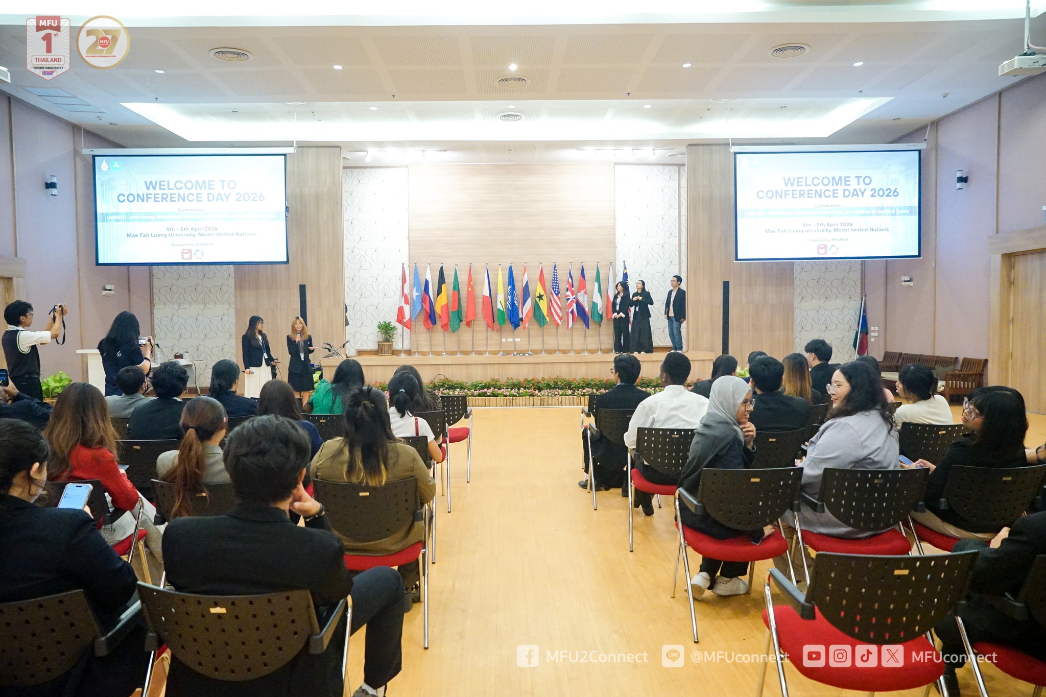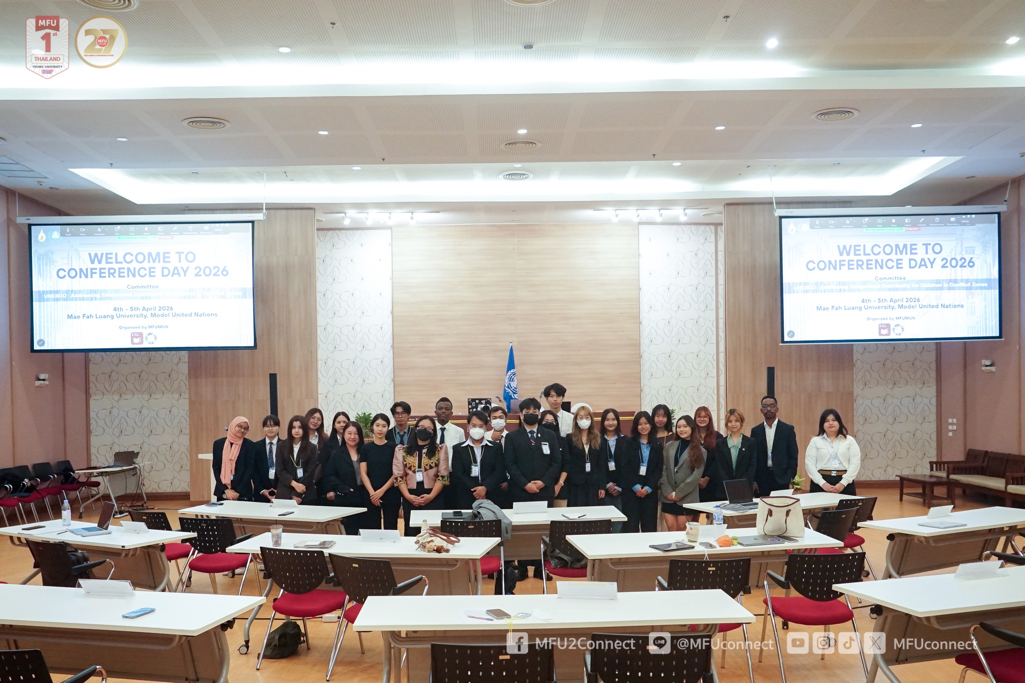 Mae Fah Luang University (MFU), led by the Mae Fah Luang Model United Nations (MFU MUN) Club in collaboration with the Global Relations Division, organised the “MFU MUN Conference 2026” on 4–5 April 2026 at the Kham Mok Luang Room, M-Square Building. This student-driven initiative brought together over 60 participants, including club members, MFU students from various schools, and members of the CMU MUN Club from Chiang Mai University.